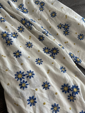 Rayon crinkle embroidered eyelet woven: REMNANT(S) White blue yellow embroidered flowers ⭐️![]()  - Regular price