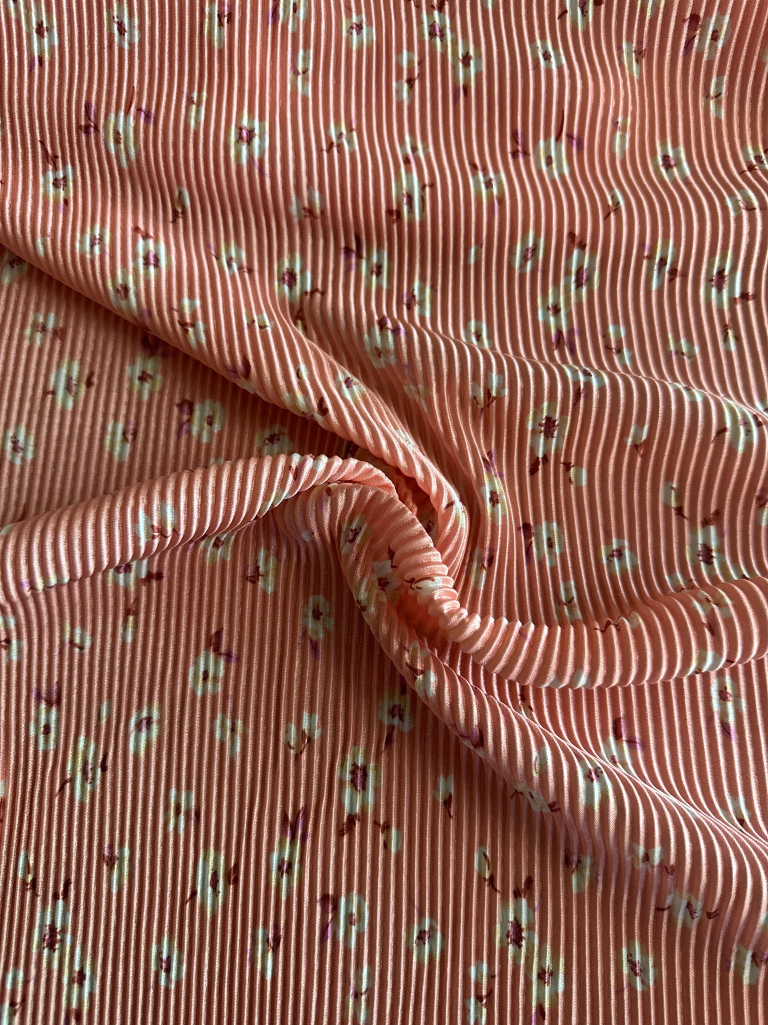 Pleated polyester (satin like): 3.5 YD CUT REMNANT Peach floral ⭐️